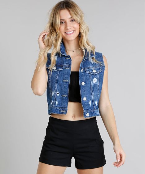 Colete Jeans Feminino Cropped Destroyed Azul Médio Cea